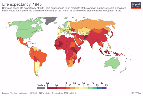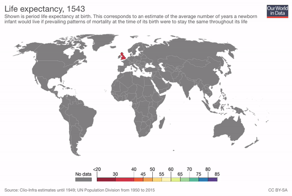 1543-2015年,各国的人均寿命(紫色代表寿命大于80岁,红色代表寿命小于30岁)。