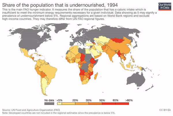 1994-2015年,世界各国营养不良的人口占比(深红色为大于65%)。