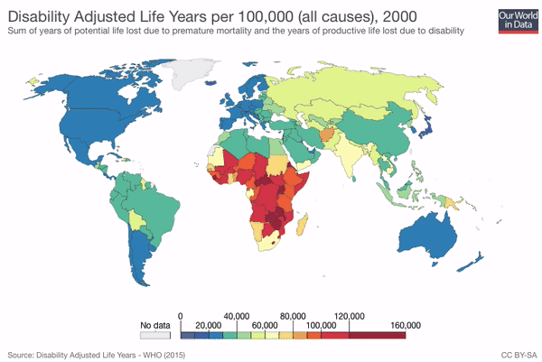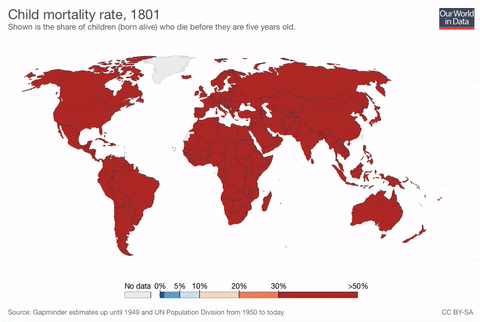 19世纪以来5岁以下儿童死亡率(深红色代表死亡比例更高)。1800年时,全世界40%的儿童会在5岁前死去,但是现在只有很少一部分儿童活不过5岁。