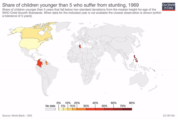 1969-2015年,5岁以下发育迟缓的儿童比例(深红色代表发育迟缓儿童的占比大)。