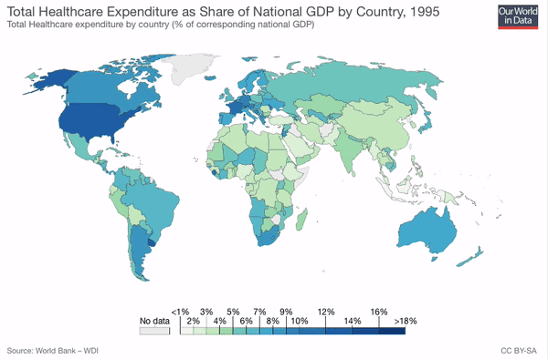 1995-2014年,医疗支出占国家/地区GDP的比值(深蓝色代表比值大于16%)。