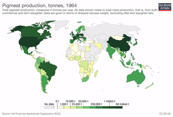 1965-2013年,各国猪肉产量(深绿色代表产量大)。▼