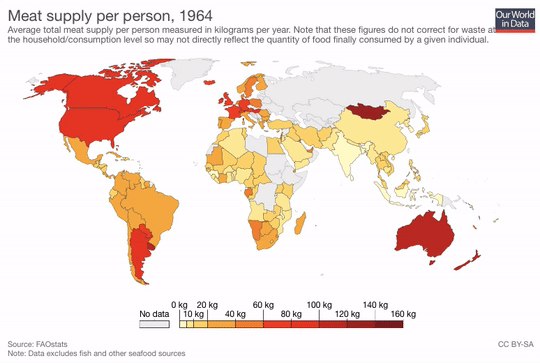 1965-2013年,人均肉类供应量(红色代表人均供应量大)。