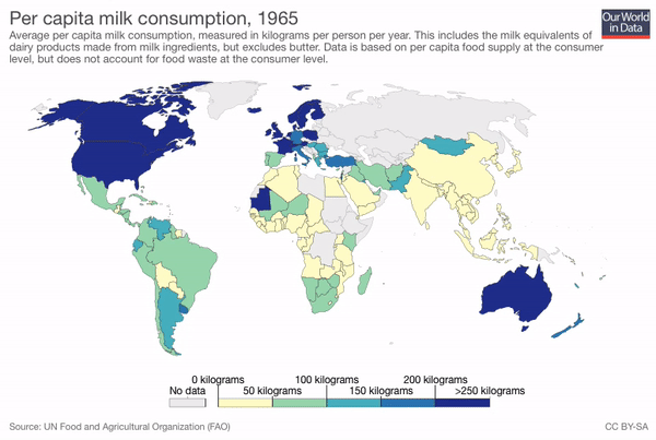 1965-2013年,各国人均牛奶消费量(深蓝色代表每人每年超过200千克)。▼