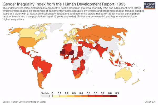 1995-2015年,各国男女不平等指数(红色代表更不平等)。