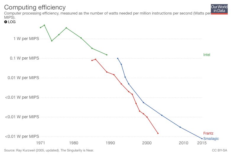 1975-2015年,计算机的每单位计算机处理能力所消耗的功率。