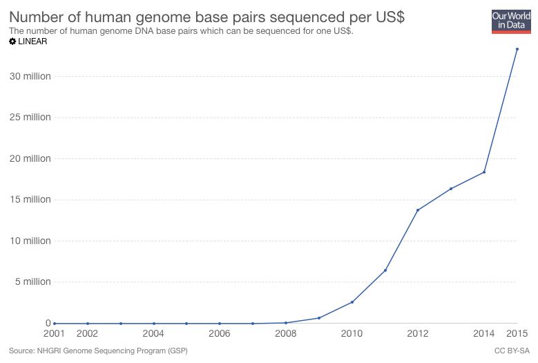 2001-2015年,1美金能够测出的人类基因组碱基对数量。