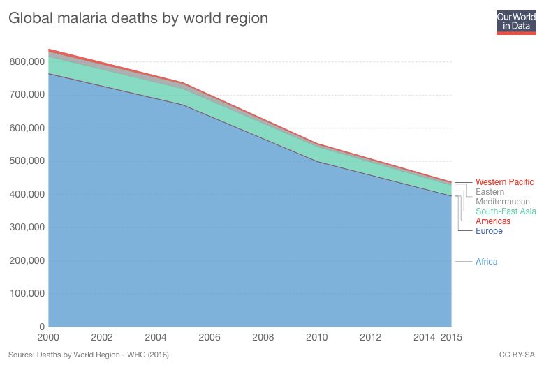 2000-2015年,世界不同地区死于疟疾的人数,蓝色为非洲,绿色为东南亚。