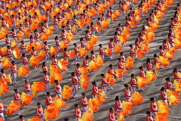 10月9日,广场舞爱好者共同表演舞蹈《舞动中国》。当日,在山西省大同市古城南城墙关城,来自山西、河南、山东、北京等地的20000余名广场舞爱好者,伴随着《舞动中国》乐曲共同起舞,传递快乐健身的理念。