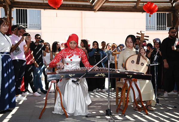 10月8日,在位于开罗的埃及博物馆内,开罗大学孔子学院的学生演奏中国民族乐器。开罗大学孔子学院文化日活动8日走进埃及博物馆,以书法、武术、剪纸等形式展示中国传统文化。