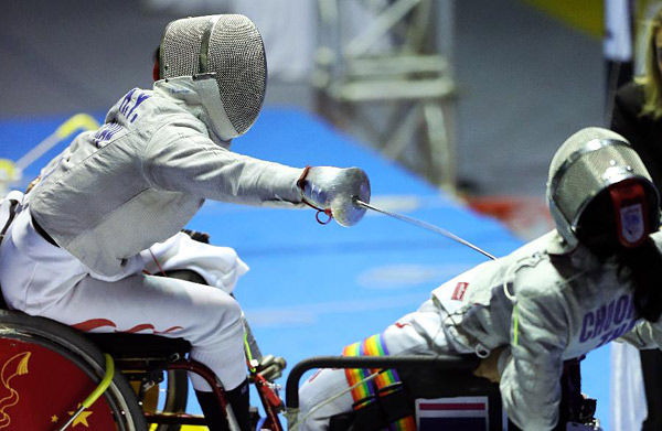 中国轮椅击剑队10月9日以横扫之势在雅加达亚残运会拿到6枚金牌,囊括当天举行的所有轮椅击剑比赛的冠军。目前已经举行的12个轮椅击剑小项的比赛中,中国队已经获得11枚金牌。