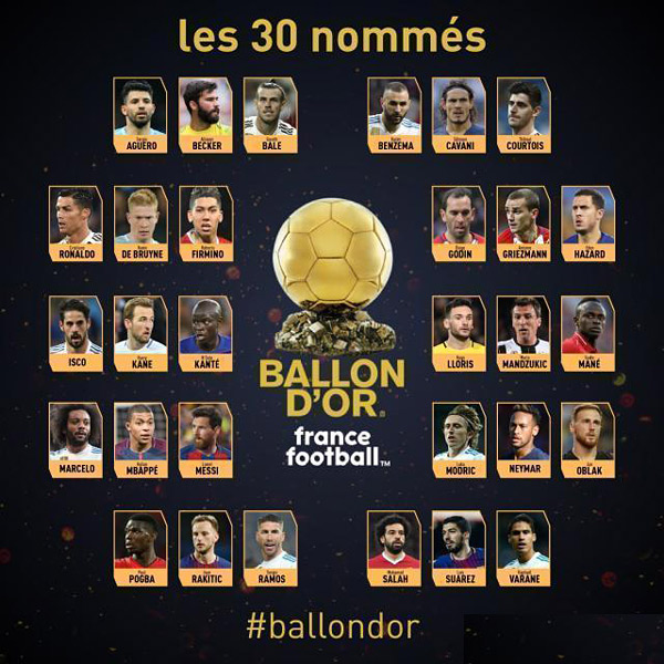 金球奖10月8日公布了30名候选人名单,世界足球先生莫德里奇榜上有名,同时被提名的还有他在皇家马德里的前队友克·罗纳尔多(C罗)、巴塞罗那的梅西和利物浦的萨拉赫。今年还首次增设女足金球奖,在15名提名者中,里昂队有7名球员入选。英格兰队主力布朗茨和日本后卫熊谷纱希也在名单当中。最终获得者将由《法国足球》杂志于12月3日公布。