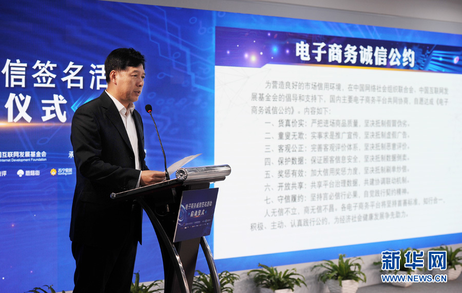 10月10日下午,由中国网络社会组织联合会和中国互联网发展基金会主办的电子商务诚信签名活动启动仪式在新华网举行。图为中国网络社会组织联合会副秘书长张勇宣读公约。新华网 郭小天 摄