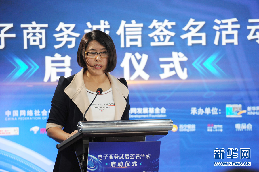 10月10日下午,由中国网络社会组织联合会和中国互联网发展基金会主办的电子商务诚信签名活动启动仪式在新华网举行。图为商家代表纸寿千年北京副经理周进婵宣读承诺书。新华网 郭小天 摄