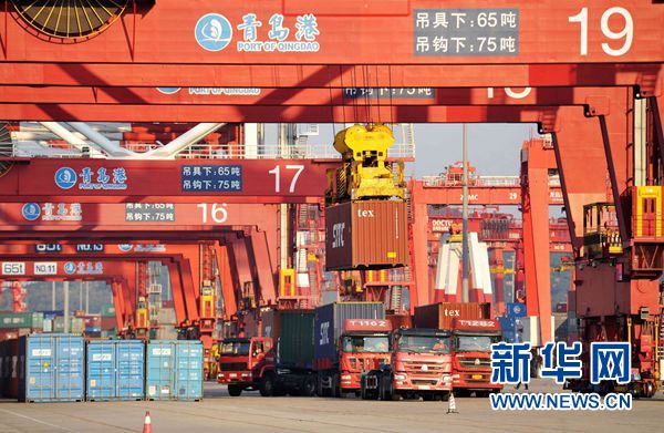 10月12日,车辆在山东青岛港外贸集装箱码头装运集装箱。 新华社发(俞方平 摄)
