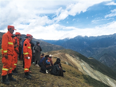 10月13日,金沙江滑坡核心区,森林消防局西藏总队昌都支队救援人员正查看地形。新京报记者 王飞 通讯员 夏能 摄