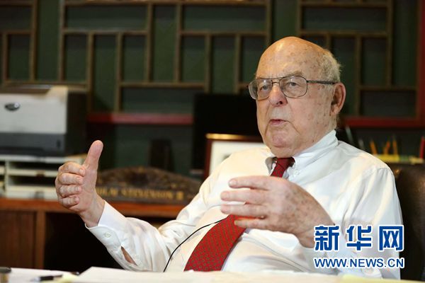 7月16日,美国前联邦参议员斯蒂文森三世在芝加哥的家中接受新华社记者专访。新华社记者汪平摄