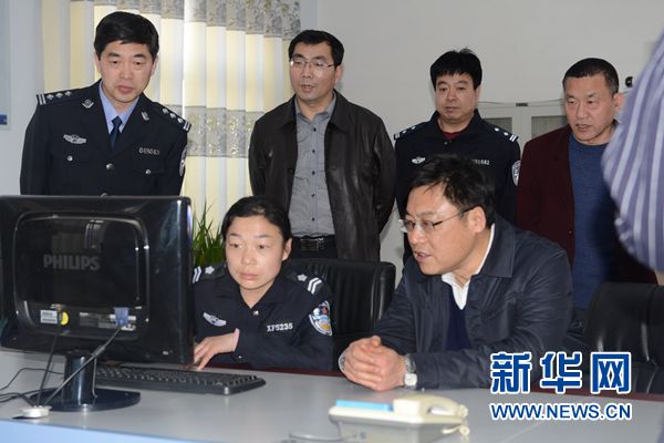 在河南省濮阳市范县高码头镇,邵景良(前右)在调研综治和平安建设工作(2016年3月3日摄)。 新华社发