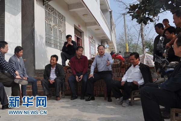吴锦(左六)与群众开“院子会”(2014年10月22日摄)。 新华社发