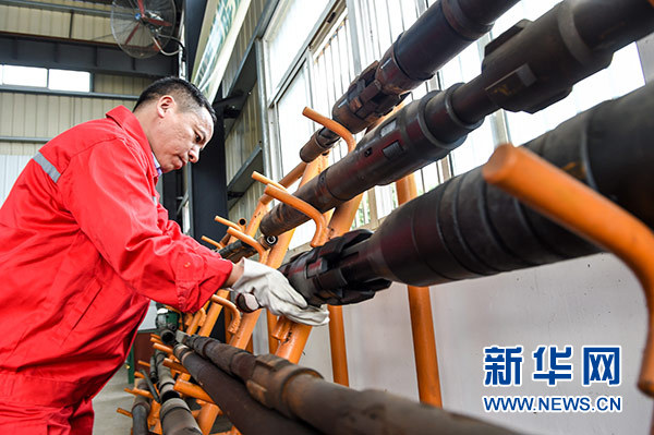在中国石化江苏油田工程技术服务中心,田明在检查设备(10月9日摄)。新华社记者 李博 摄