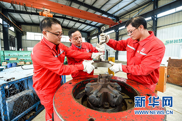 在中国石化江苏油田工程技术服务中心,田明(中)与团队工作人员在保养设备(10月9日摄)。新华社记者 李博 摄