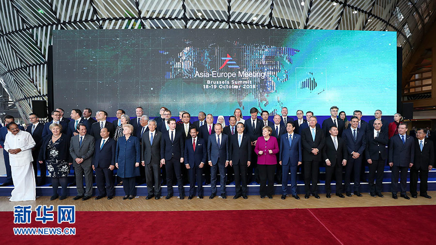 当地时间10月19日上午,国务院总理李克强在布鲁塞尔出席第十二届亚欧首脑会议。这是与会领导人合影。 新华社记者 丁海涛 摄