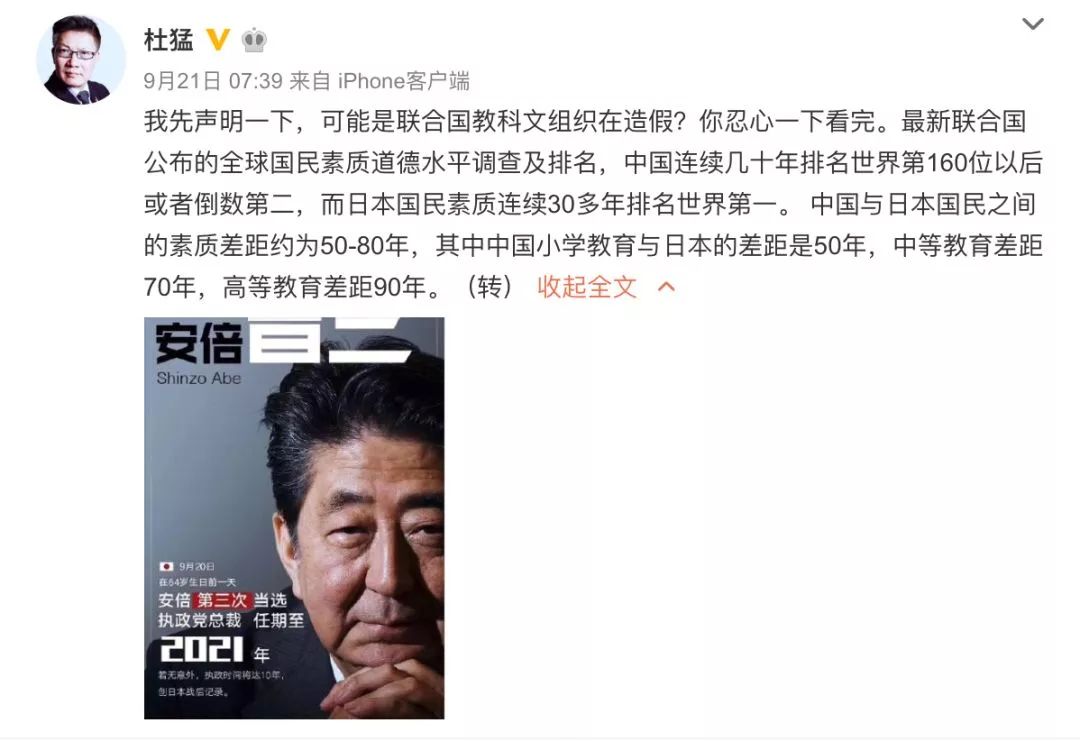 2018年9月21日,拥有近220万粉丝的大V“杜猛”一大清早就发布了一条微博:“最新联合国公布的全球国民素质道德水平调查及排名,中国连续几十年排名世界第160位以后或者倒数第二,而日本国民素质连续30多年排名世界第一。中国与日本国民之间的素质差距约为50-80年,其中中国小学教育与日本的差距是50年,中等教育差距70年,高等教育差距90年。”他虽然在微博的最后加了个括号写了个“转”字,但并未写明来源。配图内容是:前一天,安倍晋三第三次当选日本执政党总裁。