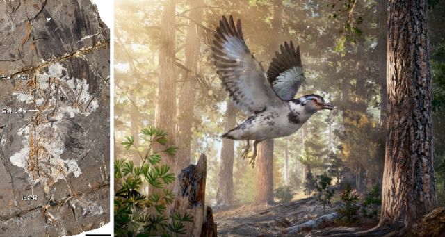 距今1.27亿年前的原始鸟类迷惑巾帼鸟化石和复原图。