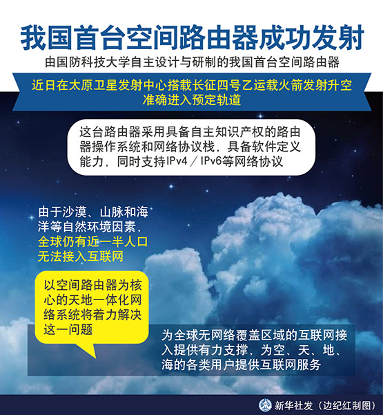 新华社长沙10月29日电(赵宝康、刘于蓝)由国防科技大学自主设计与研制的我国首台空间路由器,近日在太原卫星发射中心搭载长征四号乙运载火箭发射升空,准确进入预定轨道。