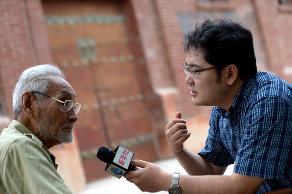 图为2015年7月,陈晨(右)在陕西省泾阳县采访抗战老兵宁西珍。