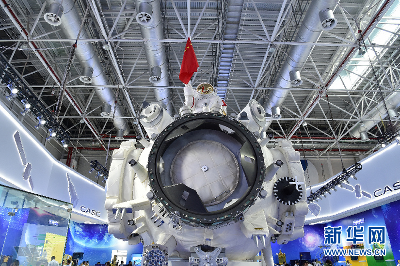 这是展出的空间站核心舱实物(工艺验证舱)(11月5日摄)。 11月6日,在广东珠海举办的第十二届中国国际航空航天博览会上,中国空间站“天和”号核心舱揭开神秘面纱,公开亮相。 新华社记者梁旭摄