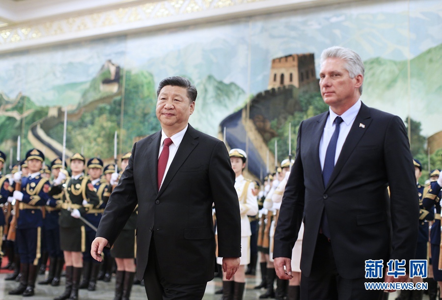 这是会谈前,习近平在人民大会堂北大厅为迪亚斯-卡内尔举行欢迎仪式。 新华社记者 王晔 摄