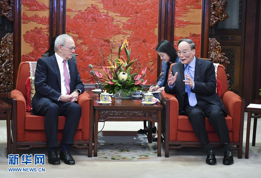 11月12日,国家副主席王岐山在北京中南海会见校长里夫率领的麻省理工学院理事会执委会成员。 新华社记者 殷博古 摄