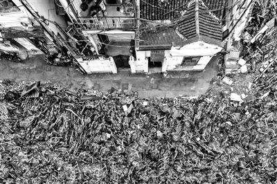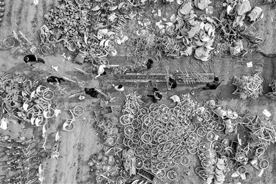 吴国勇找到一家正在负责拆卸共享单车零件的厂家,“他们就在田野里组装了个流水线,特别简陋。旁边堆了七八万辆各种品牌的共享单车。”可以想到,拍摄的请求再次被拒绝。“我的无人机刚飞上去,就有人过来了。”直到后来再次到访,通过与厂长协商,吴国勇才拍下了一些珍贵的画面。