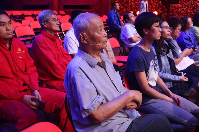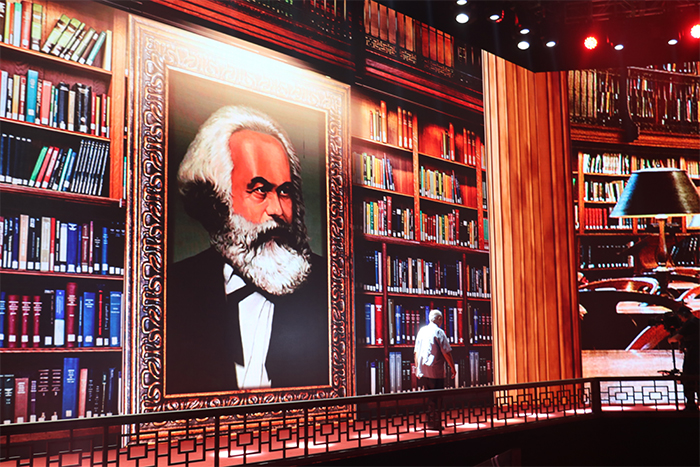 图为在节目录制现场,从马克思像前缓缓走过的宋书声老先生。