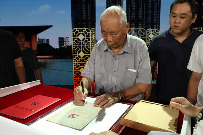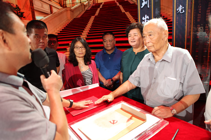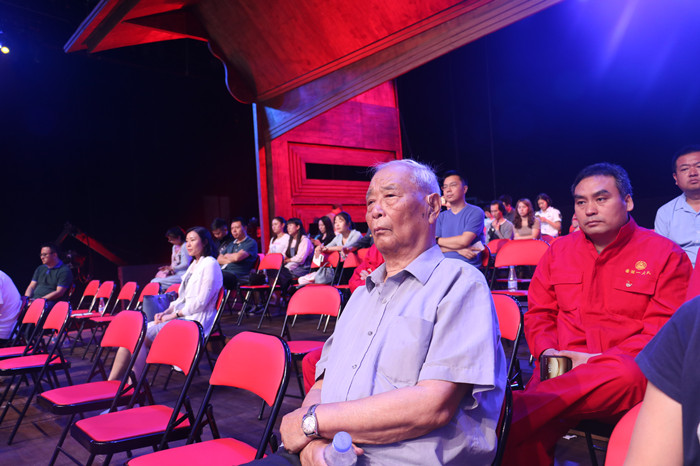图为导演讲解“把手放在党章上”这一环节的注意事项时,认真听记的宋书声老先生。
