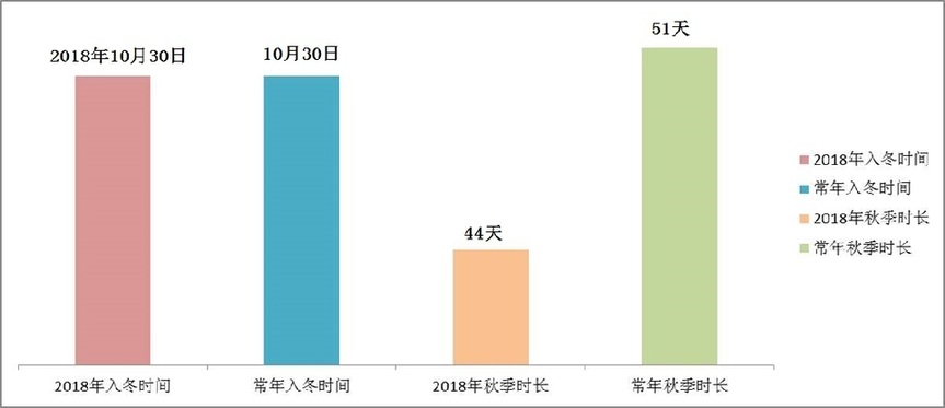 中华人民共和国气象行业标准《气候季节划分》规定:基于当年气温序列计算5天滑动平均气温构成滑动平均气温序列,当滑动平均气温序列连续5天小于10℃,则以其所对应的第一个小于10℃的日期作为冬季起始日,如果初次判断的起始日期比常年偏早15天以上,需进行起始日的二次判断。北京地区2018年入冬时间为10月30日,与常年入冬时间一致。今年北京秋天共计44天,比常年偏短7天。
