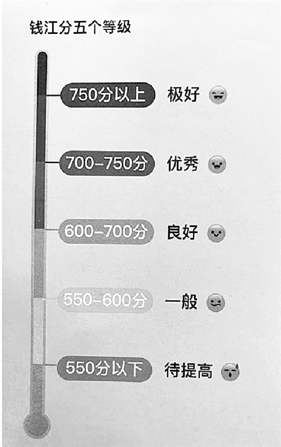 “钱江分”采用千分制,共分5个等级:当用户分数低于550分,信用待提高;550~600分信用一般;600~700分信用良好;700~750信用优秀;750分以上用户信用极好。