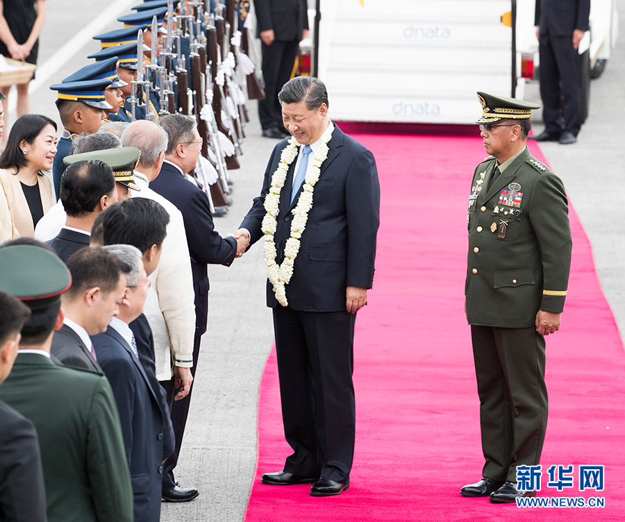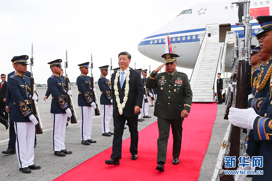 11月20日,国家主席习近平抵达马尼拉,开始对菲律宾共和国进行国事访问。这是习近平在机场受到菲律宾政府高级官员热情迎接。 新华社记者 黄敬文 摄