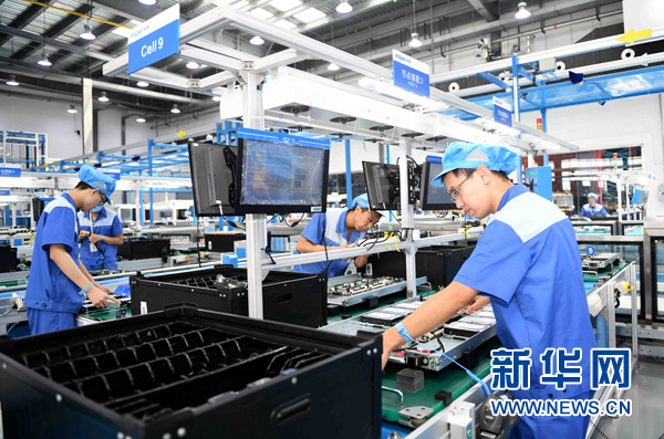 员工们在浪潮高端容错计算机产业基地生产线上工作(6月14日摄)。 新华社记者 朱峥摄