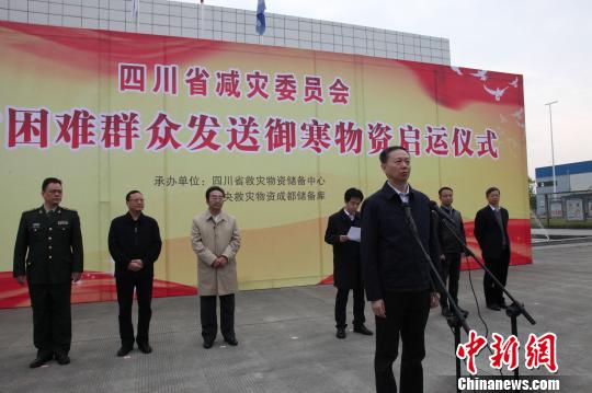 2018年冬向四川全省受灾困难群众发送御寒物资启运仪式,11月23日上午在四川省救灾物资储备中心举行。
