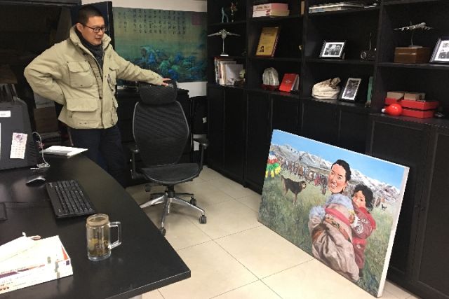宫浩钦在工作室中,正在端详自己的画作《天降神鹰》。新华社记者高杉 摄