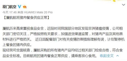 厦航称,厦航历来高度重视食品安全,近段时间中国部分地区发现非洲猪瘟疫情,公司相关部门密切关注,严格按照有关要求,加强进货渠道监管,对猪肉产品及其他原材料进行严格把关。近日,因配餐部门对有关疫情防御措施理解有误,计划暂停机上餐食的猪肉供应。