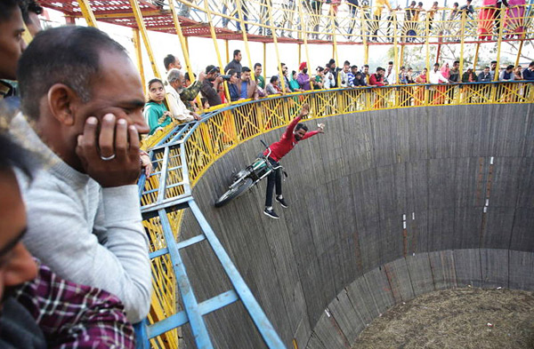 当地时间11月24日,印控克什米尔,当地举行一年一度的农民博览会, 特技演员在“死亡之井”,逆重力表演飞车技术。