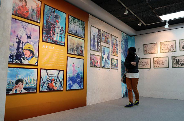 11月25日,游客在观看一组以城市建设者为主题的绘画作品。当日,《我的故事我的画——“画说四十年”主题活动优秀作品展》在上海图书馆举行。本次展览共展出“画说四十年”主题画作及故事征集活动中产生的31个故事近300幅画作,以普通市民视角出发,从个人成长,生活变化,社会变迁等方面,生动呈现改革开放四十年来,在上海发生的平凡朴素、真实动人的 “百姓故事”。