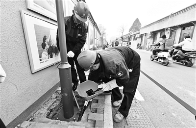 昨天傍晚,北青报记者来到东城区西总布胡同,路灯工作人员正对49盏新安装的步道灯进行检修调试。随后,工作人员与居民代表一起合上电闸,49盏新路灯齐刷刷地亮了起来。