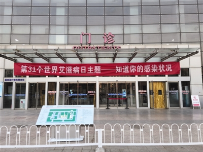 世界艾滋病日到来之际,地坛医院在门诊楼挂起条幅。