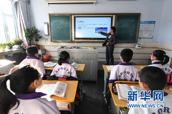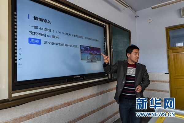 11月30日,在吉林省榆树市五棵树镇中学,教师李玉虹利用多媒体教学系统给学生们上数学课。 新华社记者 张楠摄