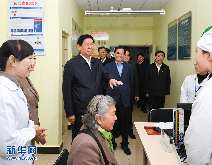 11月28日至12月1日,中共中央政治局常委、全国人大常委会委员长栗战书在云南就制定基本医疗卫生与健康促进法开展立法调研。这是11月29日,栗战书在昆明市西山区前卫社区卫生服务中心,与医务人员和就诊患者亲切交谈。 新华社记者 申宏 摄