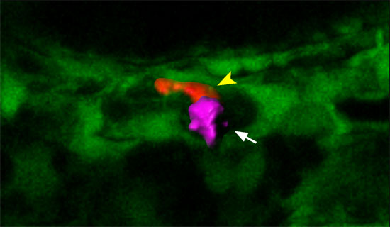 先导细胞(玫红色)引导造血干细胞(红色)归巢进入血管微环境。